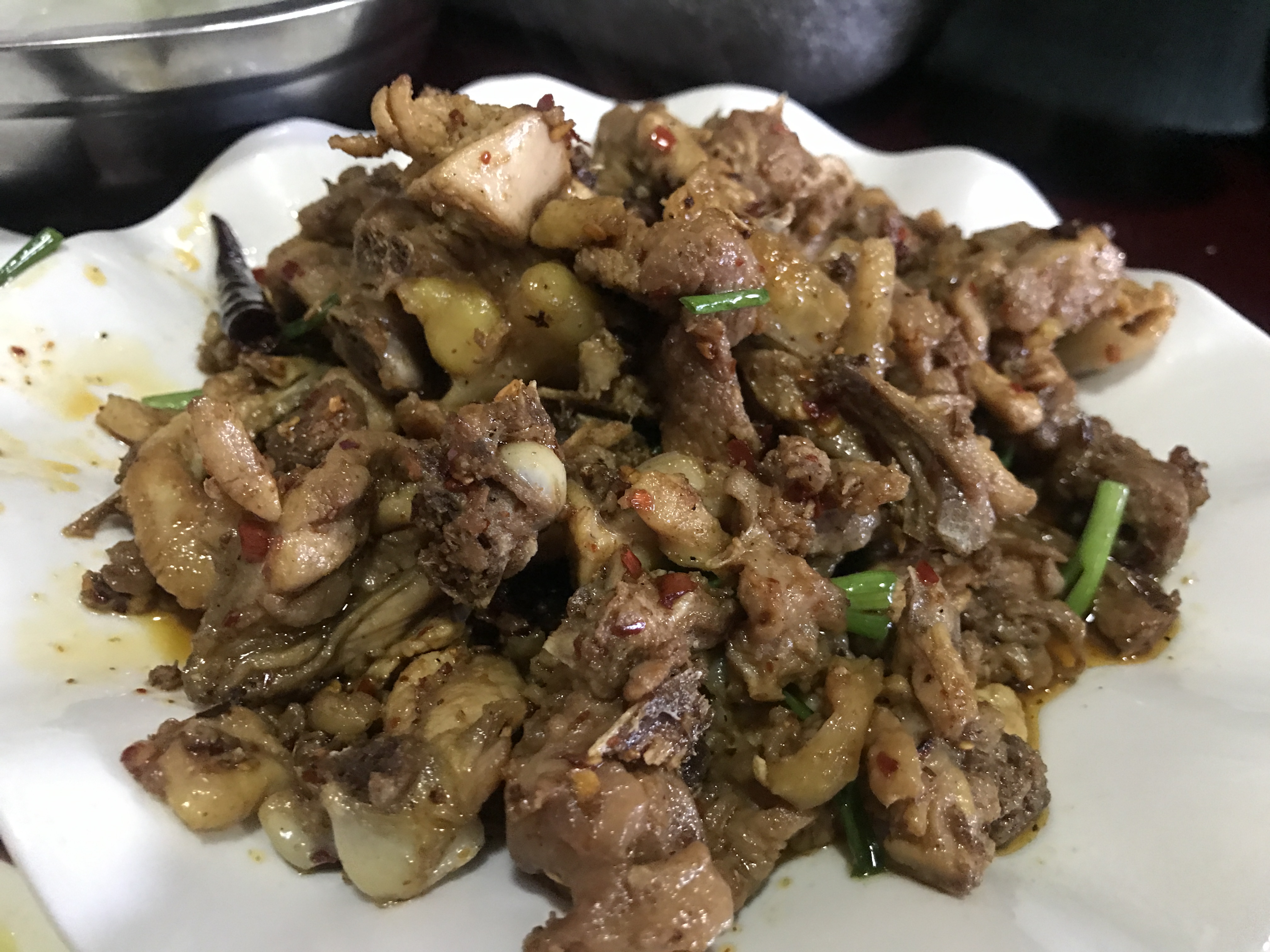 為什么要一雞兩吃呢?據(jù)了解,這道雞的準(zhǔn)確吃法是,先把肉好的雞身部分黃燜炒熟給客人吃,再加泉水將頭足、雞雜等部分清燉。黃燜爽口,清燉滋補(bǔ)。